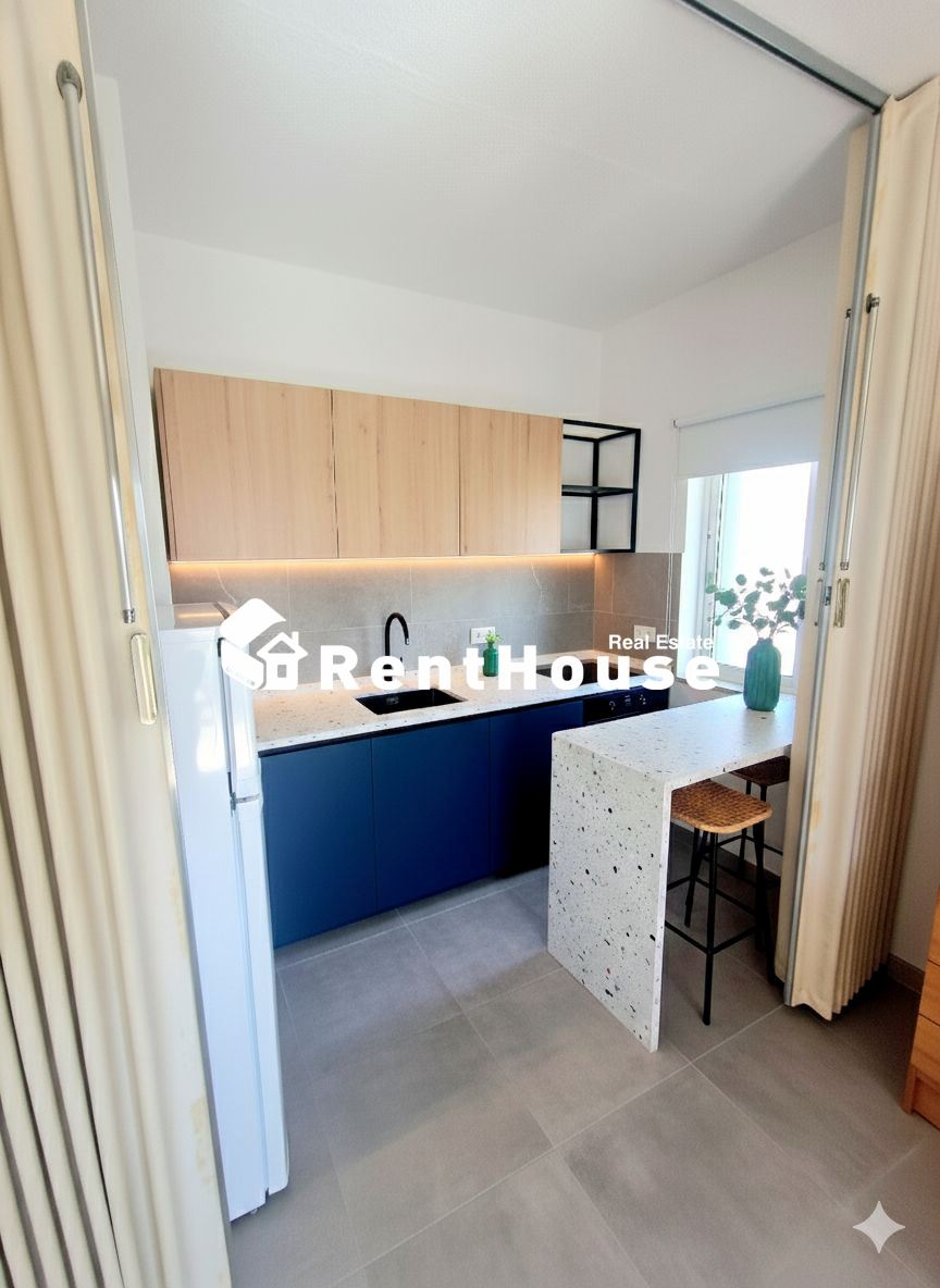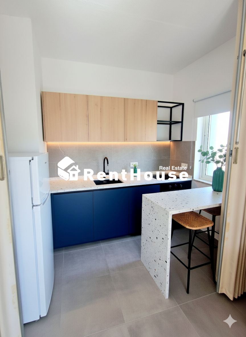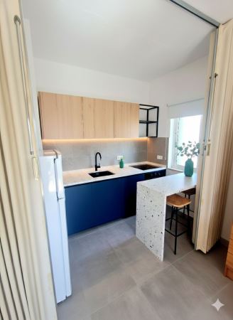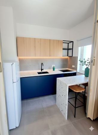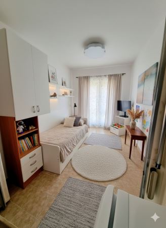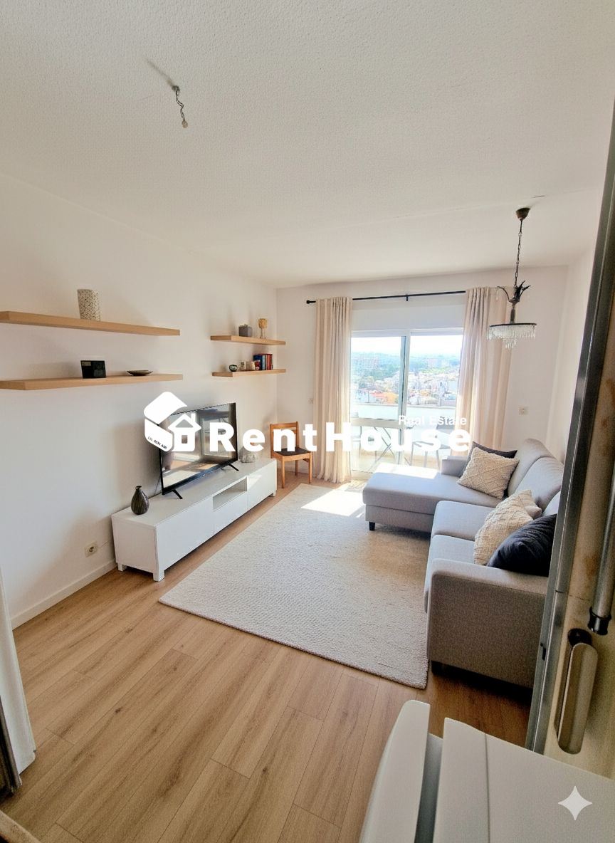 A sala, ampla e luminosa, dispõe de acesso a uma varanda virada a sul, onde se pode desfrutar do pôr do sol e da paisagem marítima. Está mobilada de forma prática e funcional, com zona de estar e de refeições. A cozinha encontra-se equipada e em bom estado de conservação.