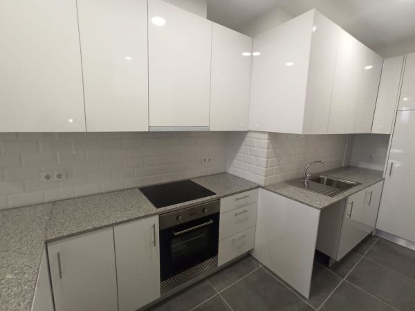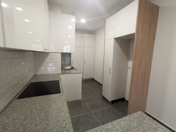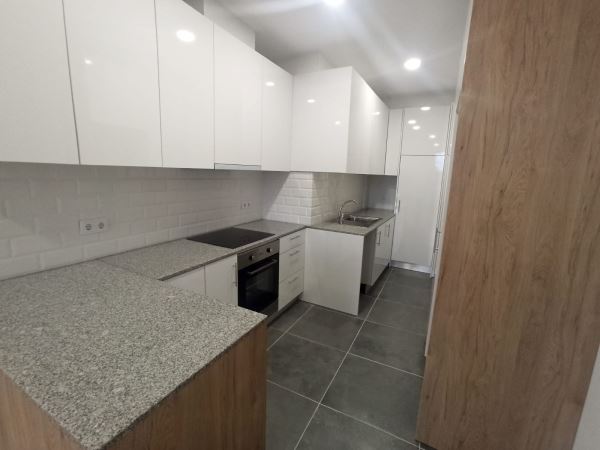Cozinha equipada com placa, forno, exaustor, termoacumulador e móvel-despenseiro.