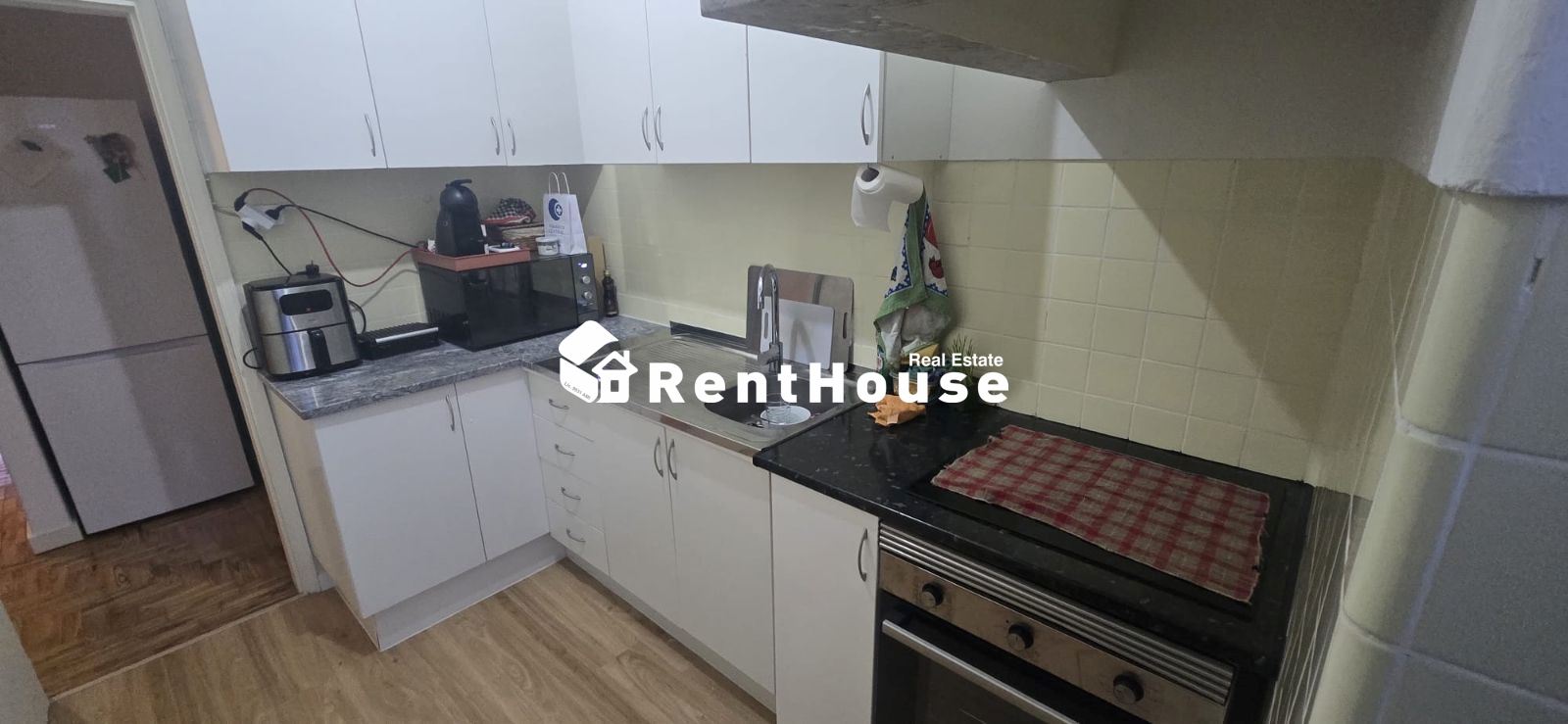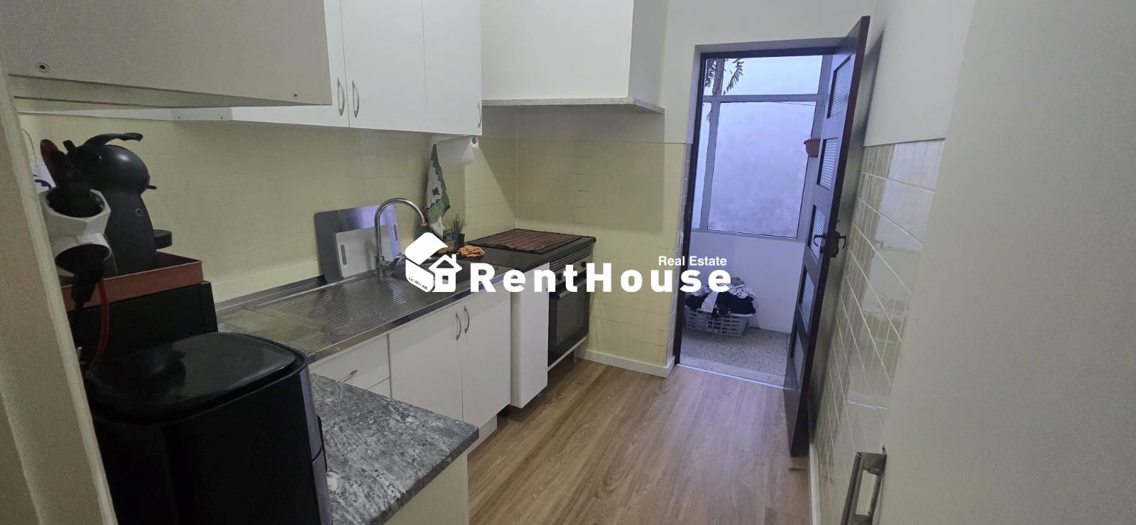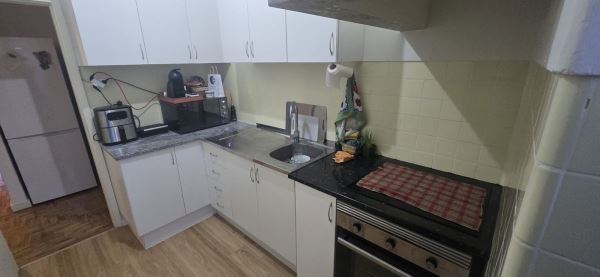 Cozinha remodelada totalmente equipada com placa forno, exaustor, frigorífico, máquina de lavar roupa e termoacumulador, bem como acesso a marquise.