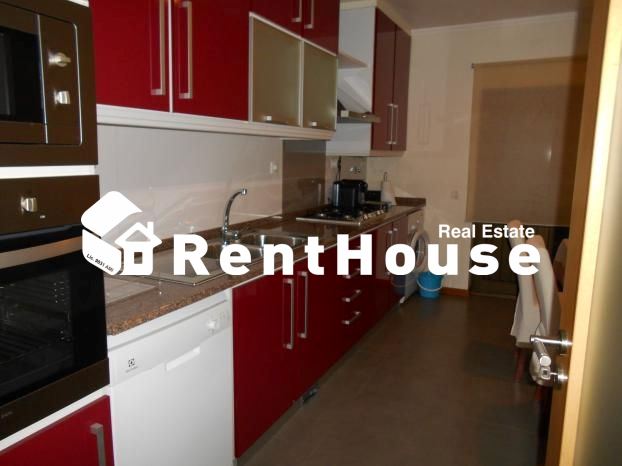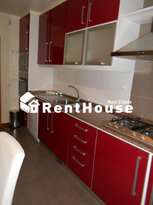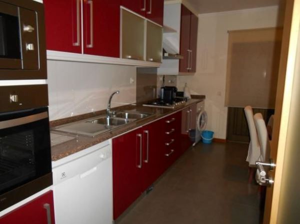 Cozinha equipada com placa, forno, exaustor, esquentador, frigorífico e máquina de lavar roupa.