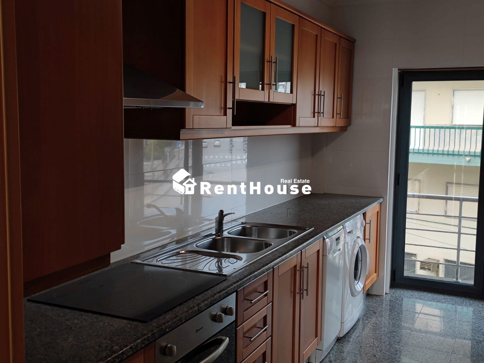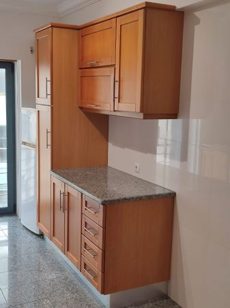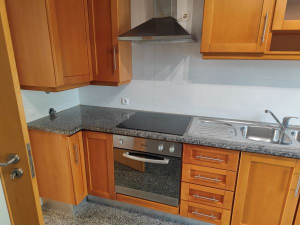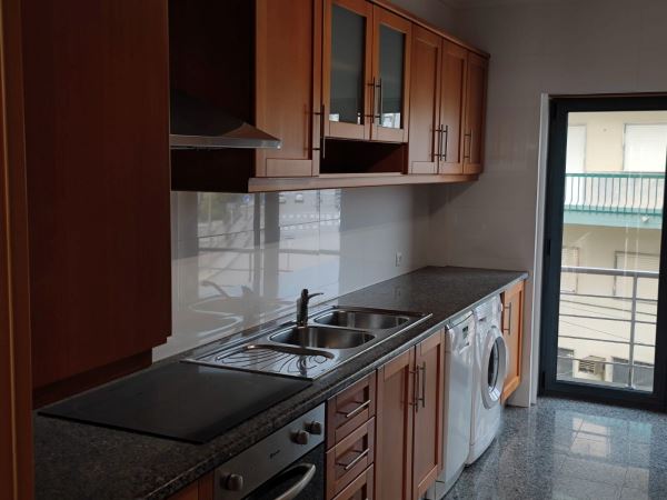 A cozinha é funcional e encontra-se totalmente equipada com placa, forno, caldeira, máquina de lavar loiça e máquina de lavar roupa, dispondo ainda de acesso a varanda, com possibilidade de colocar churrasqueira.