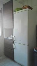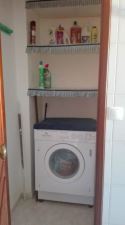 Cozinha equipada com placa, forno, exaustor, esquentador, frigorífico e máquina de lavar roupa.