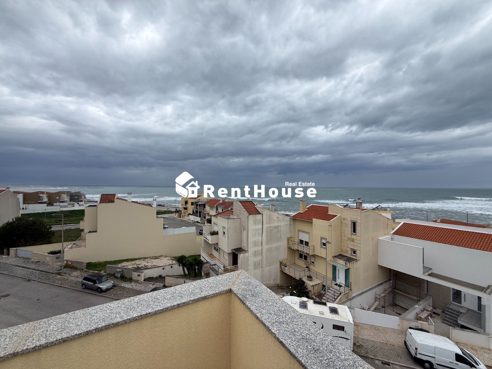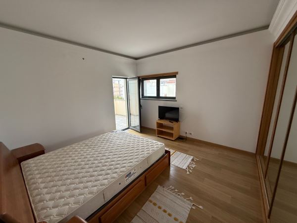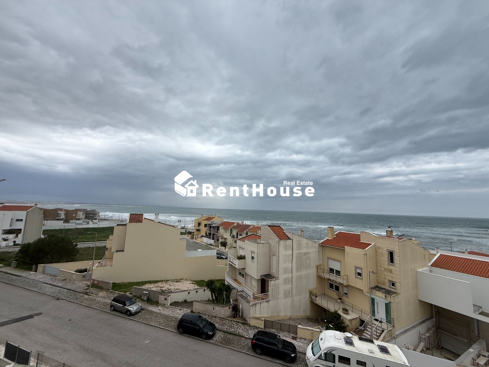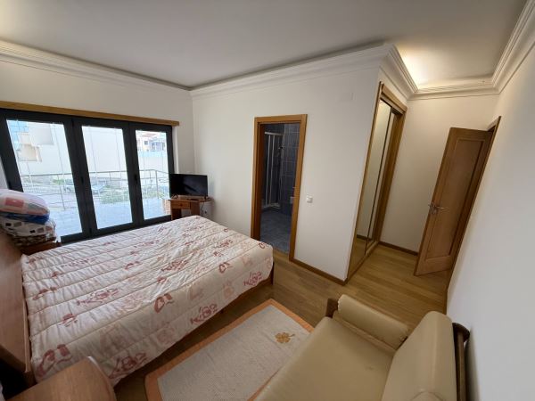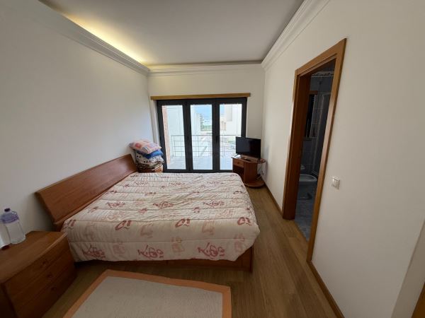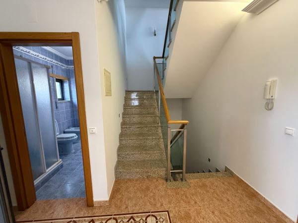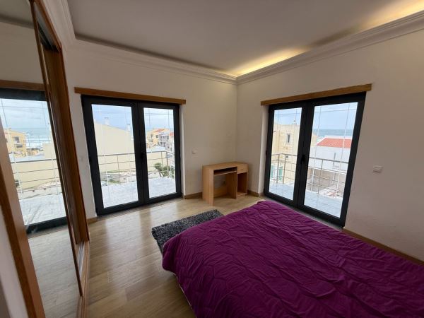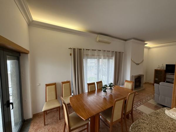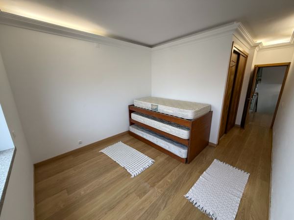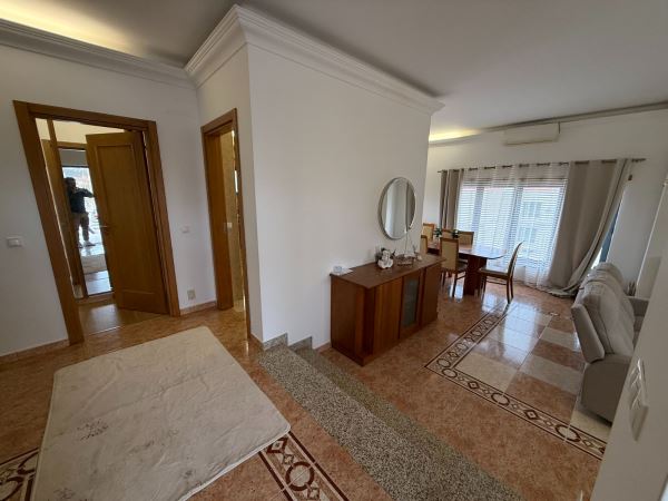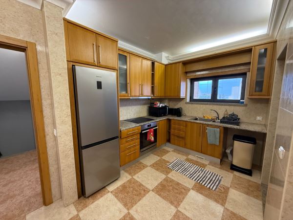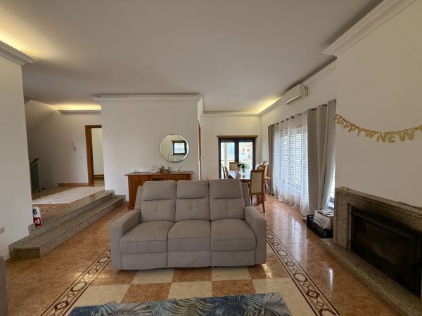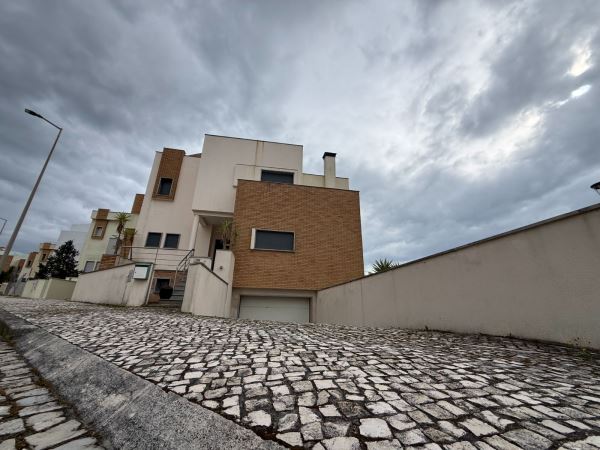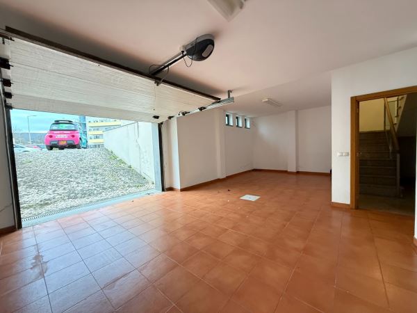A moradia distribui-se de forma funcional: na cave, uma garagem fechada de grandes dimensões ocupa toda a área de implantação, permitindo estacionamento para várias viaturas e espaço adicional para arrumação ou outras utilizações. No rés-do-chão, a zona social integra amplas salas de estar e jantar em ligação com uma cozinha moderna totalmente equipada, contando ainda com uma suíte e acesso a um jardim privado. O primeiro andar é dedicado à zona mais reservada, com três quartos espaçosos, varandas com vista mar e uma casa de banho ampla com banheira.