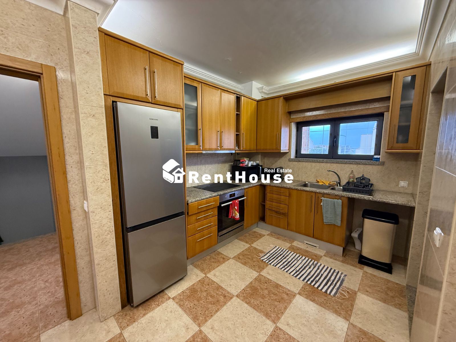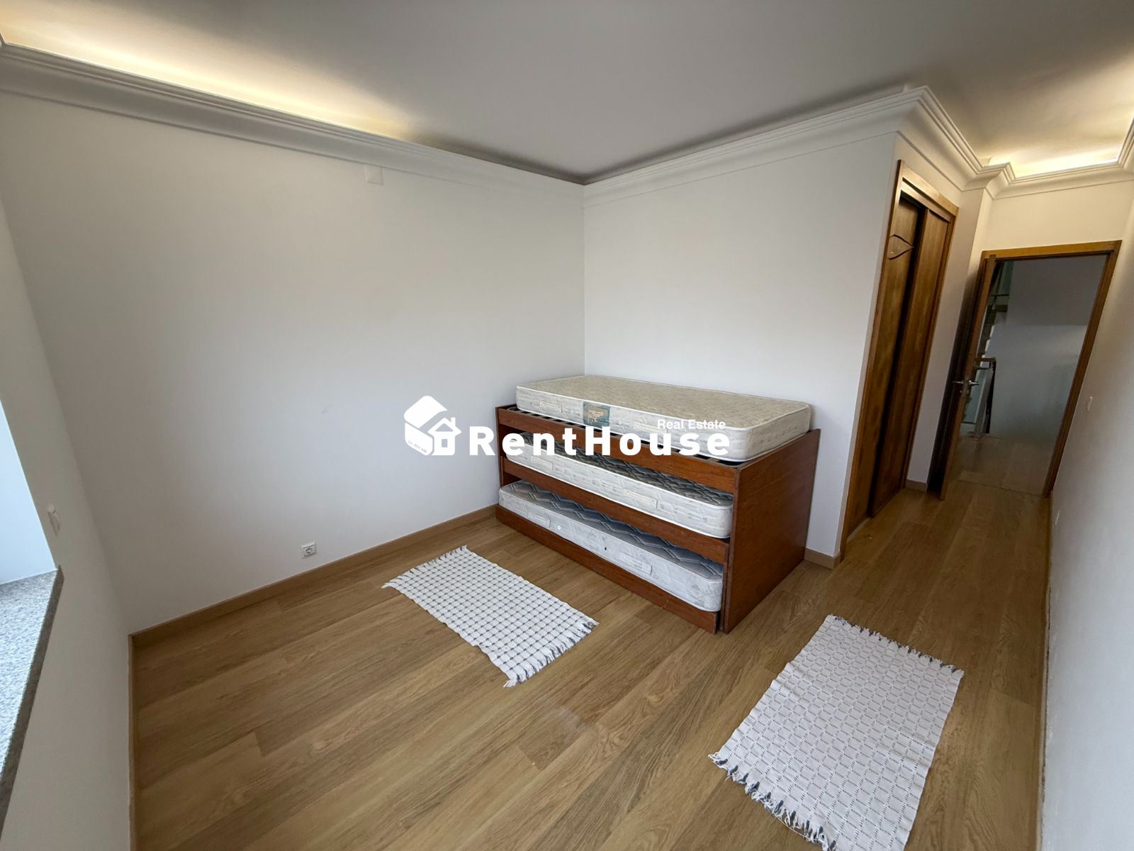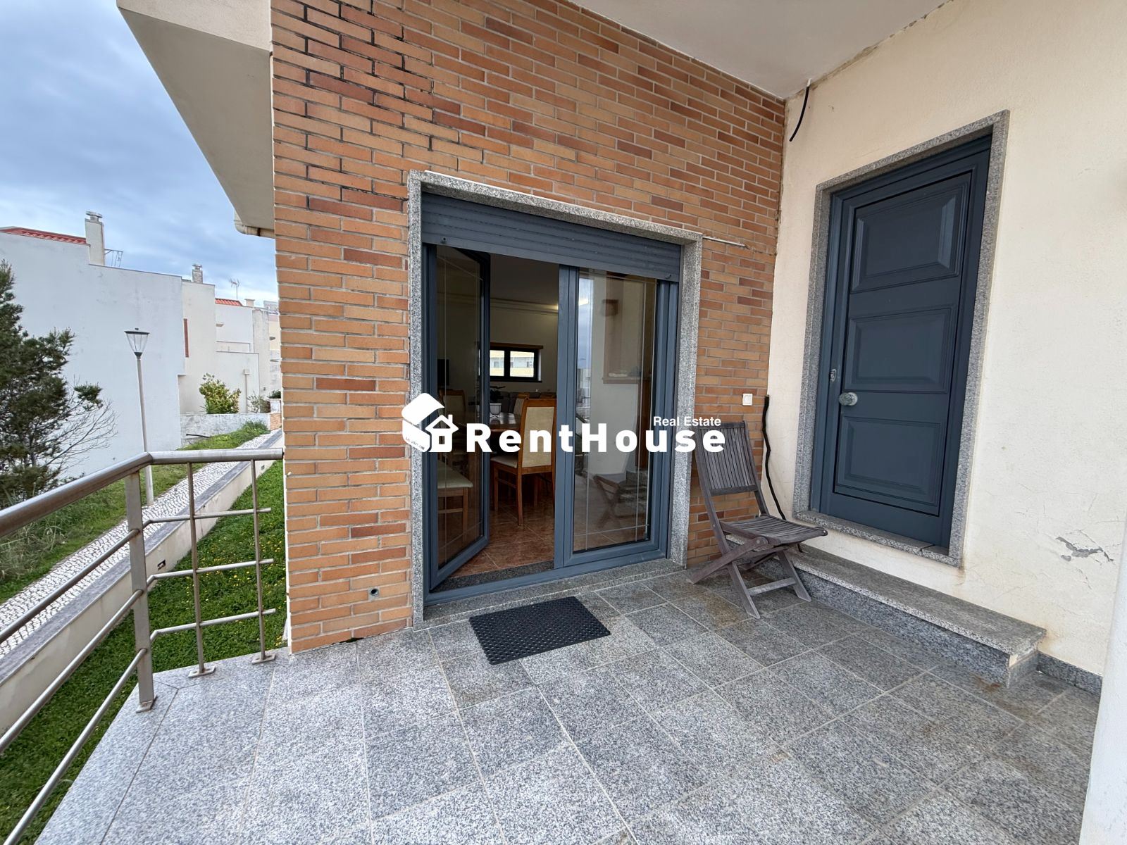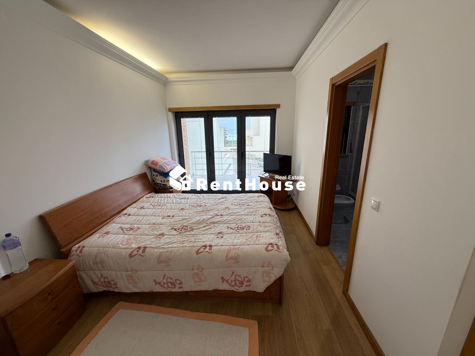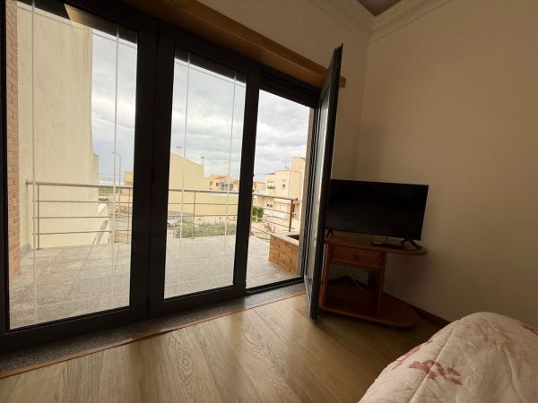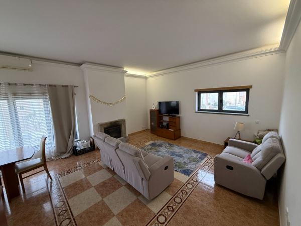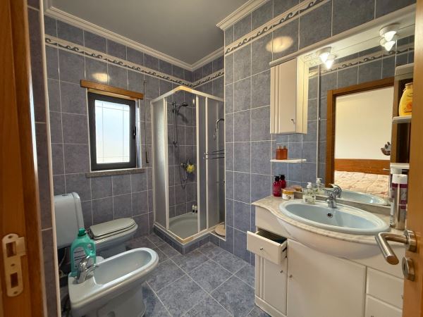 A moradia distribui-se de forma funcional: na cave, uma garagem fechada de grandes dimensões ocupa toda a área de implantação, permitindo estacionamento para várias viaturas e espaço adicional para arrumação ou outras utilizações. No rés-do-chão, a zona social integra amplas salas de estar e jantar em ligação com uma cozinha moderna totalmente equipada, contando ainda com uma suíte e acesso a um jardim privado. O primeiro andar é dedicado à zona mais reservada, com três quartos espaçosos, varandas com vista mar e uma casa de banho ampla com banheira.